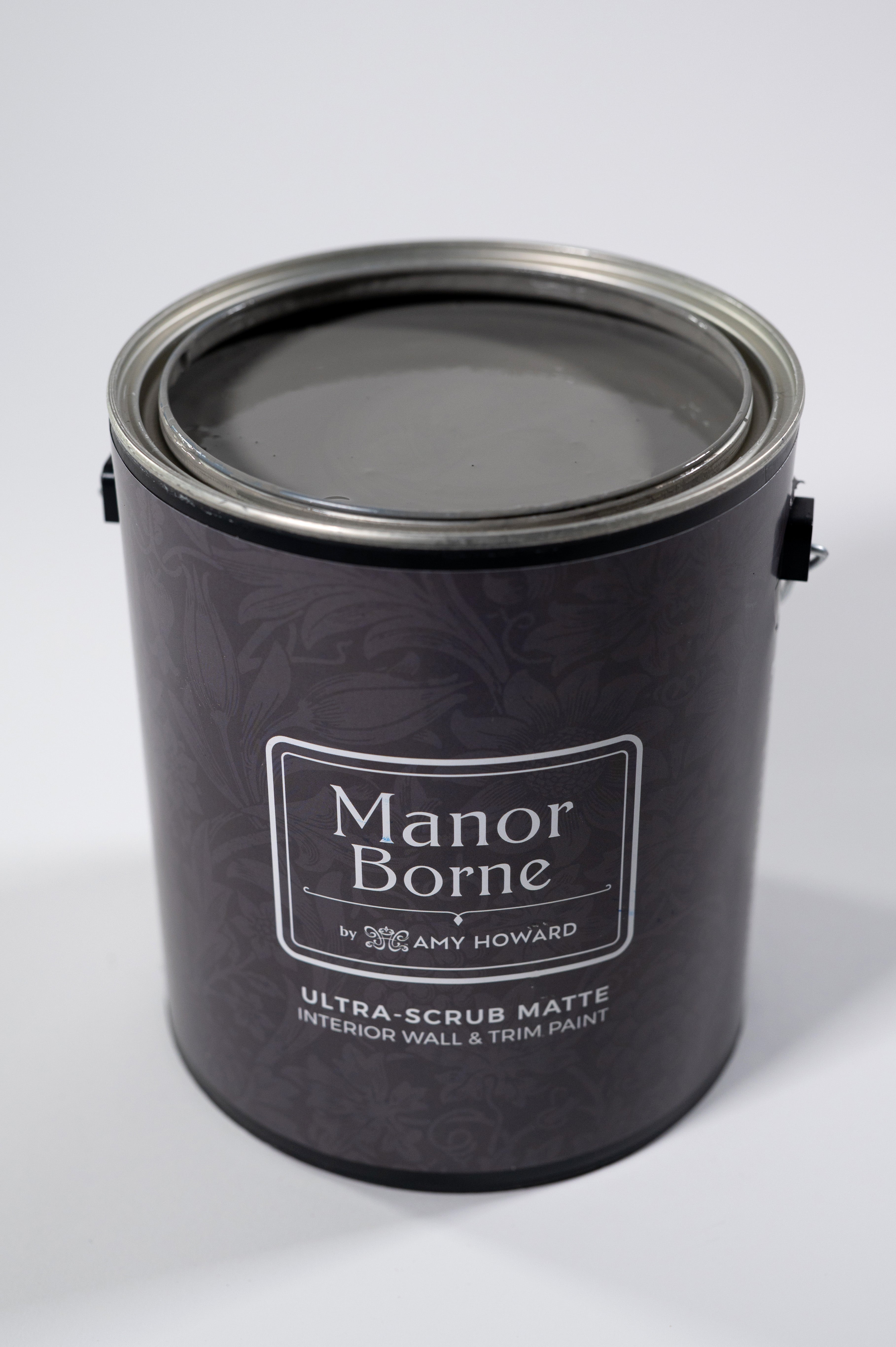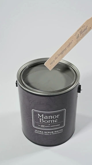 Iron Gate in Manor Borne Wall Paint offers long-lasting beauty and effortless application, with a scrubbable matte finish, built-in primer, UV protection, and a low-VOC, water-based formula.